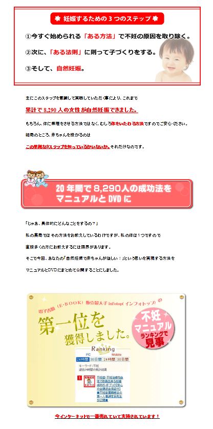 でも、子供が大好きで3~4人ほしかった、私の心のどこかには、まだうっすらと「妊娠への憧れ」を捨てきれていませんでした。そして、ネットで何気にボタンを押すと、タン先生が自然妊娠する方法を教えると自信を持って言ってました。「あまりにも子供がほしくて、私は変なものまで信じるようになってしまったなあ。」と思いつつ、そのDVDを購入してしまったんです。今まで不妊治療に何百万円も費やしてきた私たちです。17800円のDVD安い。安すぎるので逆に効果を信じなくて、DVDが来てもさぼど効果に期待せずに見ました。でも、10日後、本当に受精していた。あんなに頑固だった私の不妊症はなんだったんだ?